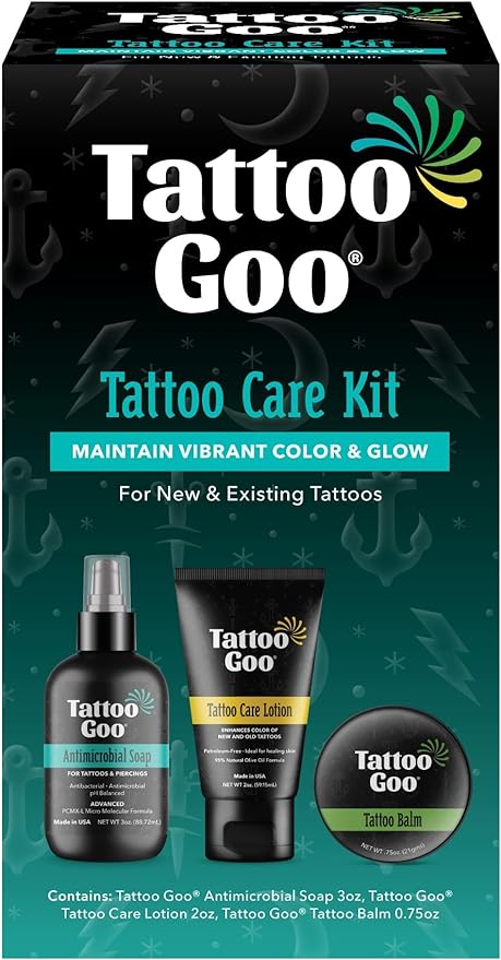 Tattoo Goo Aftercare Kit Includes Antimicrobial Soap, Balm, and Lotion, Tattoo Care for Color Enhancement + Quick Healing - Vegan, Cruelty-Free, Petroleum-Free (3 Piece Set)