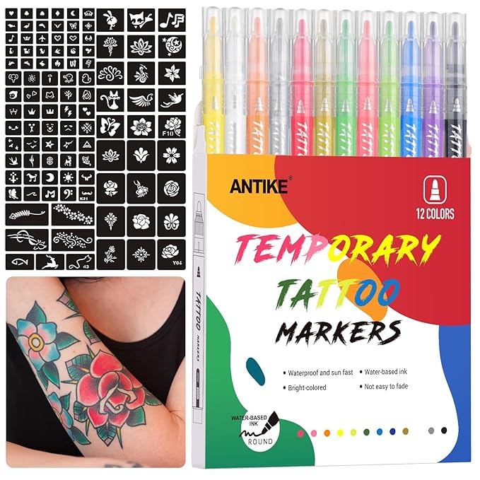 Advantages: ANTIKE’s temporary tattoo markers are perfect for creating fun and creative designs. These washable markers come in various colors and include unique stencils for easy application. They are safe for all skin types and can be easily removed, making them ideal for temporary tattoos and body art.